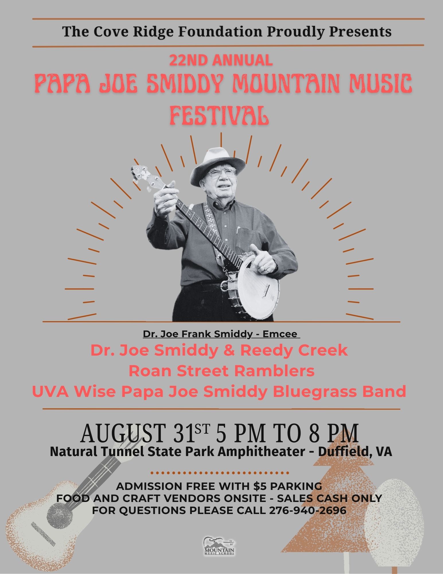 የፓፓ ጆ ስሚዲ ማውንቴን ሙዚቃ ፌስቲቫል የአፓላቺያን ሙዚቃ በዓል ነው። የድሮ ጊዜ እና ብሉግራስ ሙዚቃ በአፓላቺያ ተራሮች ውስጥ ረጅም ታሪክ ያለው ሲሆን ኮቭ ሪጅ ፋውንዴሽን እነዚህን ወጎች ለመጠበቅ እና በወጣትነታችን ውስጥ ለእነሱ ፍቅር እንዲኖራቸው ይፈልጋል። ፌስቲቫሉ የተሰየመው ለቨርጂኒያ ዩኒቨርሲቲ በዋይዝ ቻንስለር ኤሜሪተስ ዶር. ጆሴፍ ሲ "ፓፓ ጆ" ስሚዲ፣ ታዋቂው አስተማሪ፣ አዝናኝ እና የድሮ ሙዚቀኛ።