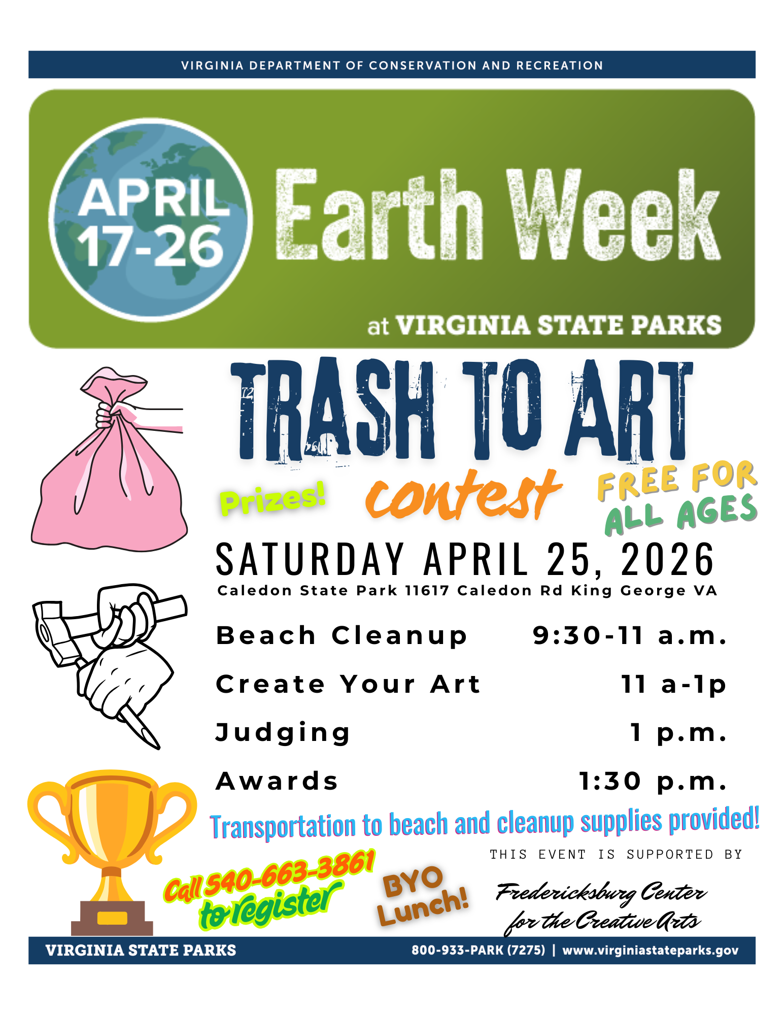 Give back to our beautiful planet and create art at Caledon State Park as part of our annual Earth Week celebration. Meet at the picnic shelter for a wagon ride to the beach to collect materials, then use that trash to create a unique piece of art. Judges will select winners and award some cool prizes. Work in teams or by yourself, and bring a lunch and snacks to fuel your creative process. This event is supported by the Fredericksburg Center for Creative Arts. For more information and to register, call the Visitor Center at 540-663-3861.